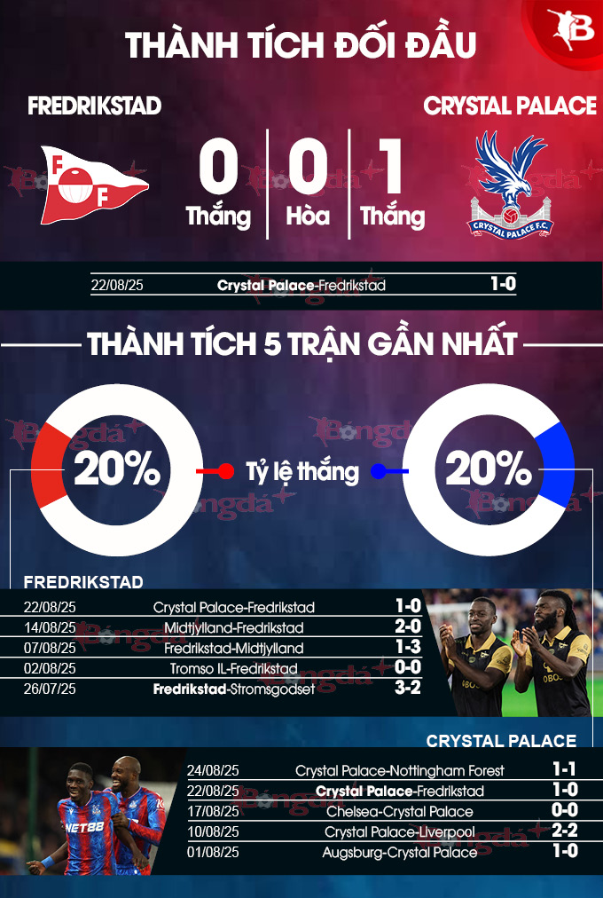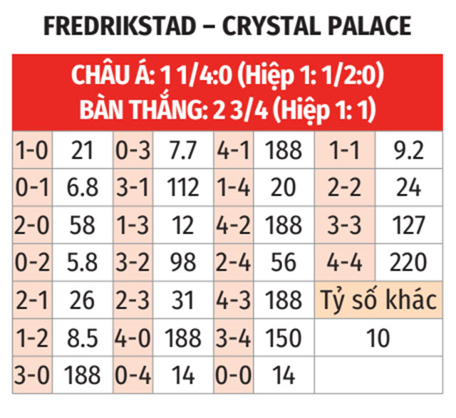 - Tỷ số chẵn: 3/4 trận vừa qua của Fredrikstad có tỷ số chẵn. 3/4 trận gần đây của Crystal Palace cũng diễn ra theo kịch bản tương tự.