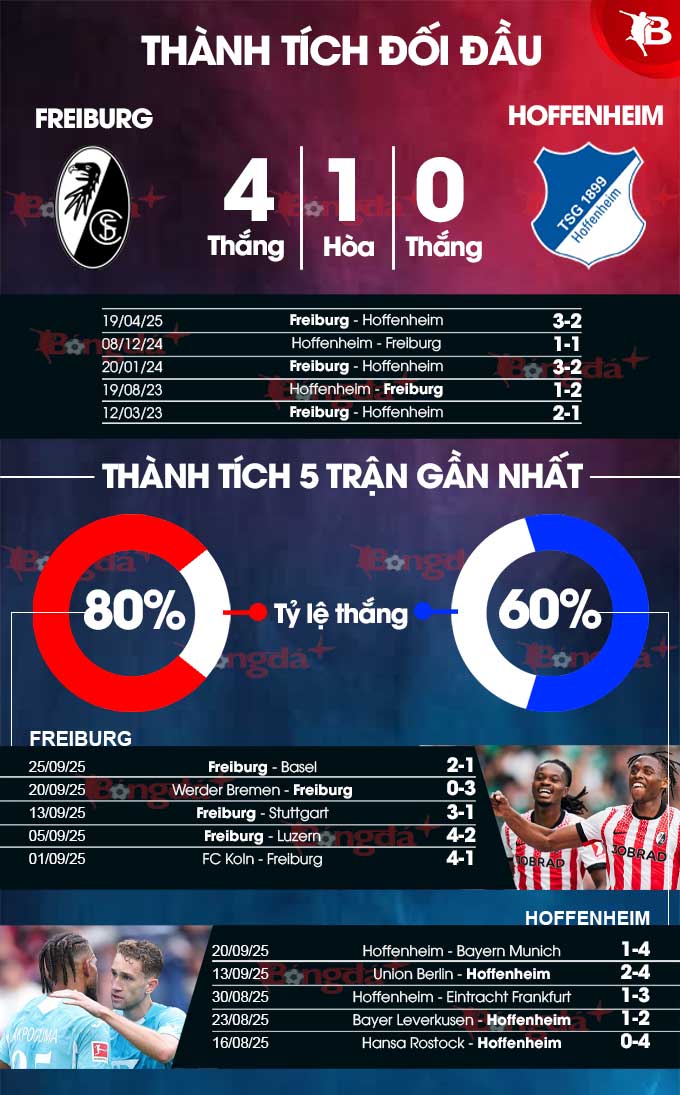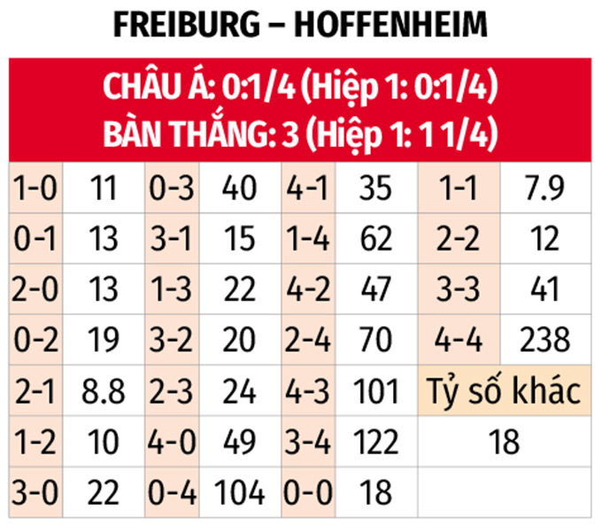 - Từ 3 bàn thắng trở lên: 5 trận gần đây của Freiburg cùng 7 trận liên tiếp vừa qua của Hoffenheim có ít nhất 3 bàn thắng. 4/5 trận đối đầu gần nhất cũng có tối thiểu 3 pha làm bàn.