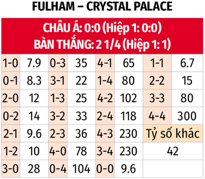 - Lẻ bàn thắng: 3 trận liên tiếp của Crystal Palace cùng 4/5 trận gần đây của chủ nhà Fulham đều kết thúc với tổng bàn thắng là lẻ. Kịch bản lẻ bàn thắng cũng diễn ra ở màn so T gần nhất hồi tháng 3 vừa qua.