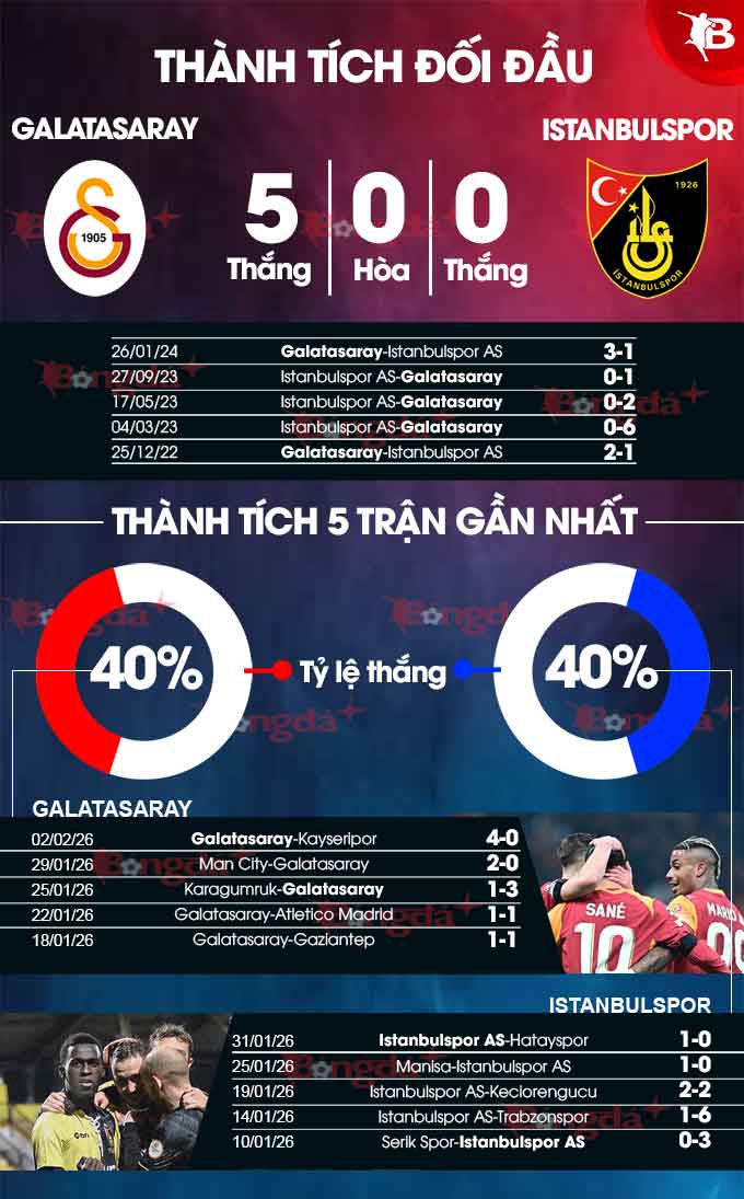 Galatasaray có lợi thế sân nhà và thành tích tốt tại đây khi thắng 5, hòa 2 và thua 1 ở 8 trận gần nhất, còn Istanbulspor AS chỉ thắng 3/10 trận sân khách vừa xong. Chưa hết, Galatasaray bất bại trước đối thủ ở 11 lần so T trước đây (thắng 9, hòa 2) và còn sở hữu đội hình chất lượng hơn đối thủ. Không ngạc nhiên nếu Galatasaray giành chiến thắng ở trận này.