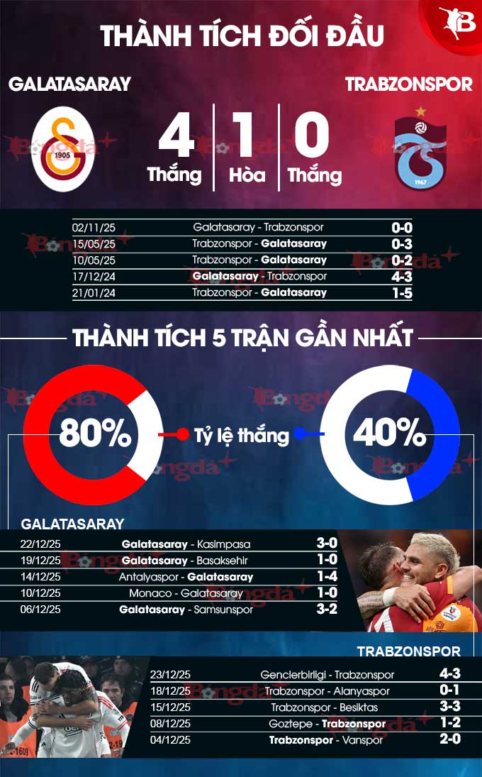Phong độ của Galatasaray và Trabzonspor đang có sự chênh lệch. Trong khi Galatasaray thắng 4/5 trận gần nhất thì Trabzonspor chỉ thắng 1/4 trận vừa qua. Chưa hết, 7 lần gần nhất so T với nhau, Galatasaray thắng đối thủ tới 6 và hòa 1.