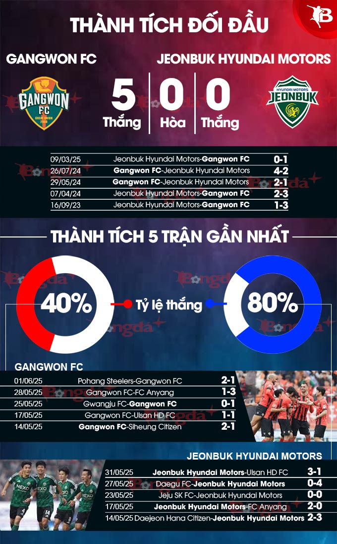 Tuy không có phong độ tốt, nhưng với thành tích áp đảo và đội hình đầy đủ, nhiều khả năng Gangwon FC sẽ chấm dứt chuỗi bất bại của Jeonbuk Hyundai Motors tại K-League ở con số 13.
