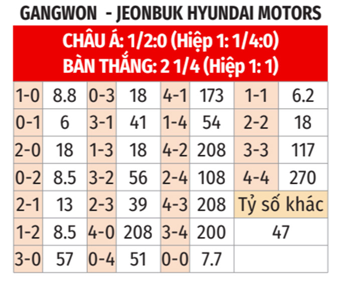 - Lẻ bàn thắng: 7/9 cuộc đối đầu gần nhất giữa hai đội, 8/12 trận gần đây của Gangwon FC và 7/10 chuyến làm khách vừa qua của Jeonbuk Hyundai Motors đều khép lại với tổng bàn thắng là lẻ. Ngoài ra, 5/6 cuộc đụng độ gần đây giữa hai đội tại Gangwon FC cũng có tổng bàn thắng không chia hết cho 2.