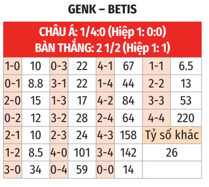 - Genk thua theo châu Á: Trong khi Genk đang có chuỗi 3 trận thua theo châu Á liên tiếp, thì điều ngược lại đã diễn ra ở cả 4 trận vừa qua của Betis. Khi các vị khách có duyên như vậy, đứng về phía họ là giải pháp khá an toàn.