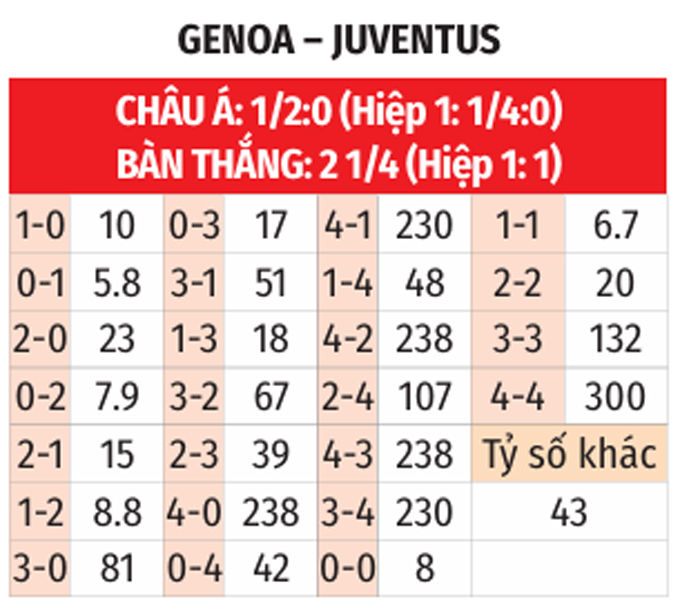 - Lẻ bàn thắng: 3/5 trận đối đầu vừa qua giữa Genoa vs Juventus có tổng bàn thắng không chia hết cho 2. Ngoài ra, 4/6 trận sân nhà vừa qua của Genoa và 7/10 trận mới đây của Juventus đều chứng kiến điều tương tự.