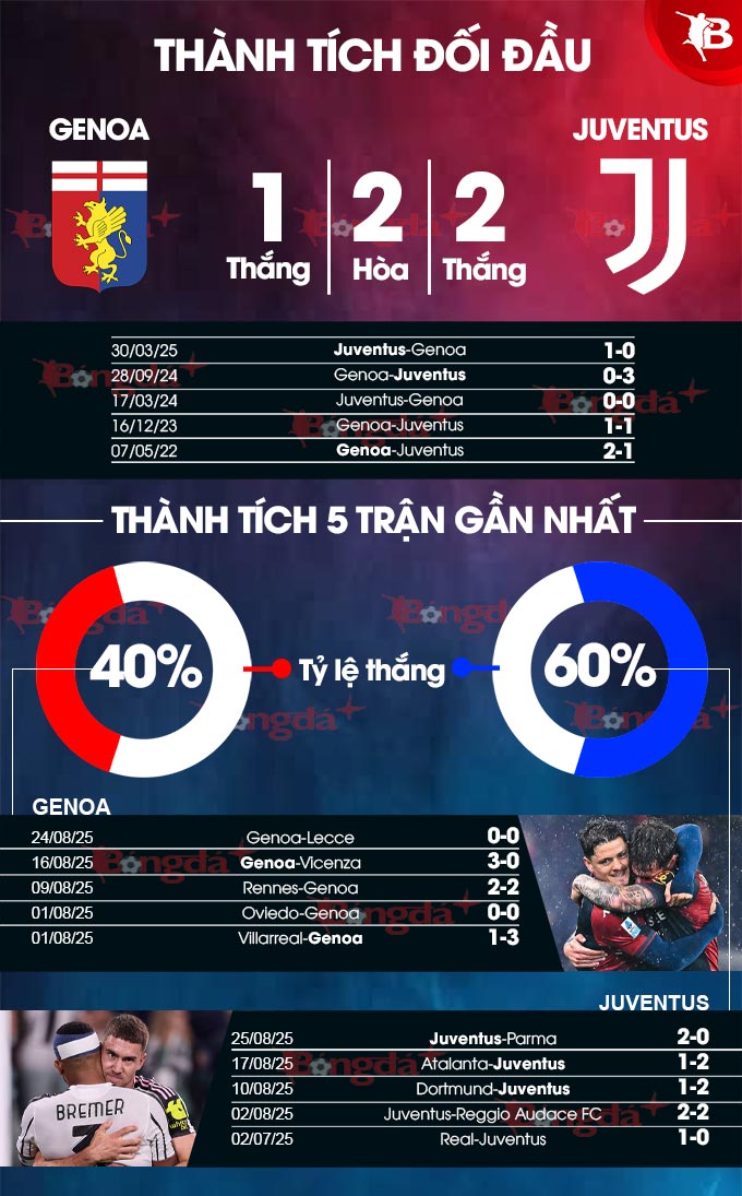 Ở ngày khai mạc Serie A 2025/26,Juventus đã giành chiến thắng 2-0 trước Parma. Nhờ đó, họ tạm thời đứng thứ 4 trên BXH. Tới vòng đấu này, Juventus có cơ hội giành trận thắng thứ 2 liên tiếp khi đối thủ chỉ là Genoa.