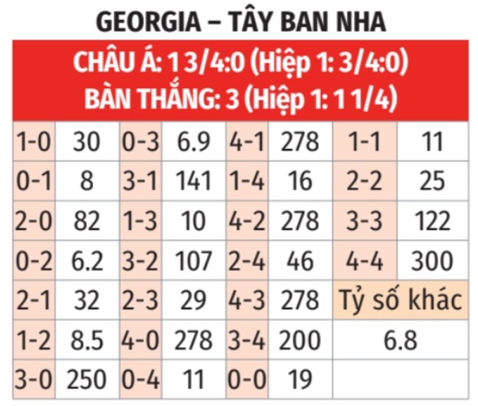 - Tối thiểu 3 bàn thắng: 5/6 lần gặp giữa 2 đội gần đây đều xuất hiện tối thiểu 3 bàn thắng. 3/4 trận gần đây của Georgia và 10/11 trận vừa qua của Tây Ban Nha xảy ra tình trạng tương tự.