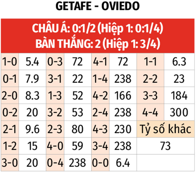 - Getafe thua kèo hiệp 1: 4 trận đối đầu gần nhất giữa hai đội đều chứng kiến Getafe thua kèo trong hiệp đấu đầu tiên. Trận ra quân gần đây nhất cũng chứng kiến Getafe thua kèo trước giờ nghỉ. Với Real Oviedo, trận đấu gần nhất họ đánh bại Sociedad ngay trong hiệp một.