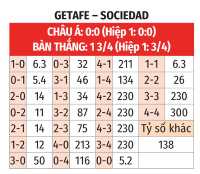 Getafe thua hiệp 1 theo châu Á: Getafe thua hiệp 1 theo châu Á ở 5/7 trận gần nhất. Thực tế trên cộng với việc Sociedad thắng hiệp 1 theo châu Á ở 3/4 trận vừa qua là lý do các nhà đầu tư không nên ủng hộ họ trước giờ nghỉ.