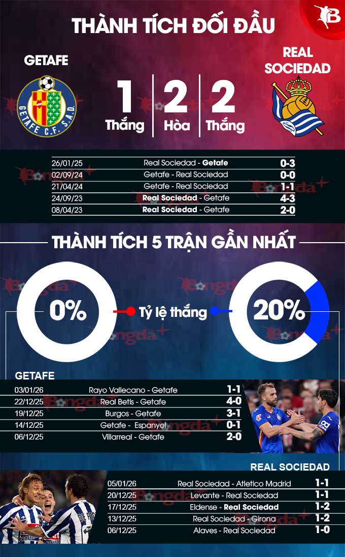 Đáng chú ý, pha lập công nói trên mới là bàn thắng đầu tiên Getafe ghi được trong 4 trận gần nhất. Với chỉ 14 lần làm tung lưới đối phương sau 18 vòng, Getafe đang là đội sở hữu hàng công tệ thứ 2 ở La Liga 2025/26 sau đội bét bảng Real Oviedo (mới có 8 bàn). Khi thể hiện phong độ kém cỏi như vậy, Getafe không xứng đáng được xem là mối đe dọa với Sociedad