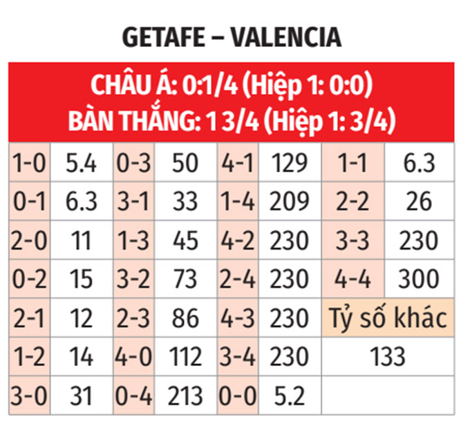 - Tổng bàn thắng chẵn: 3/4 trận gần đây của Getafe kết thúc với tỷ số chẵn. 4/5 trận vừa qua của Valencia cũng có số bàn thắng chia hết được cho 2.