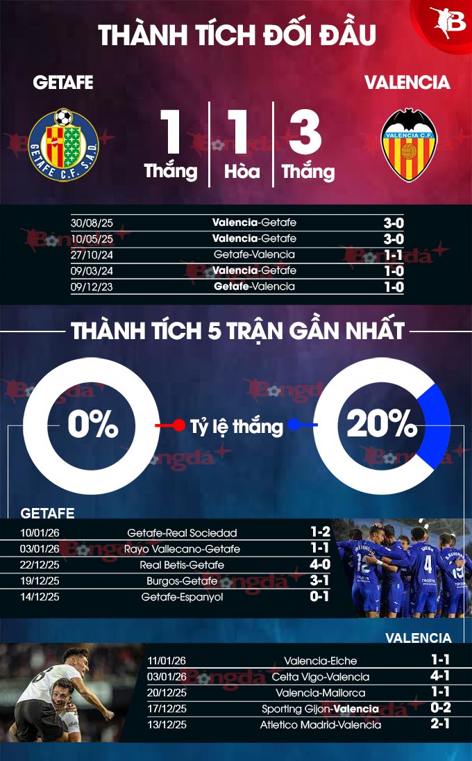 Ở trận lượt đi, Getafe từng thảm bại 0-3 khi viếng thăm sào huyệt của Valencia. Đây đã là trận thứ 4 liên tiếp Valencia bất bại trước Getafe và chuỗi trận này hứa hẹn sẽ chưa dừng lại.