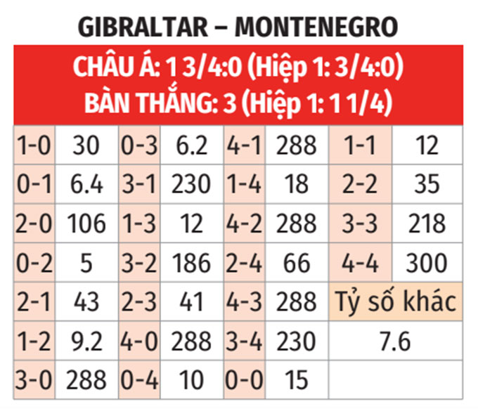 - Gibraltar thắng hiệp 1 theo châu Á: Trong khi Montenegro đang có chuỗi 8 trận thua hiệp 1 theo châu Á, thì điều ngược lại đã diễn ra ở 4/5 trận vừa qua của Gibraltar. Căn cứ vào thực tế trên, các nhà đầu tư nên ủng hộ đội chủ nhà trước giờ nghỉ.