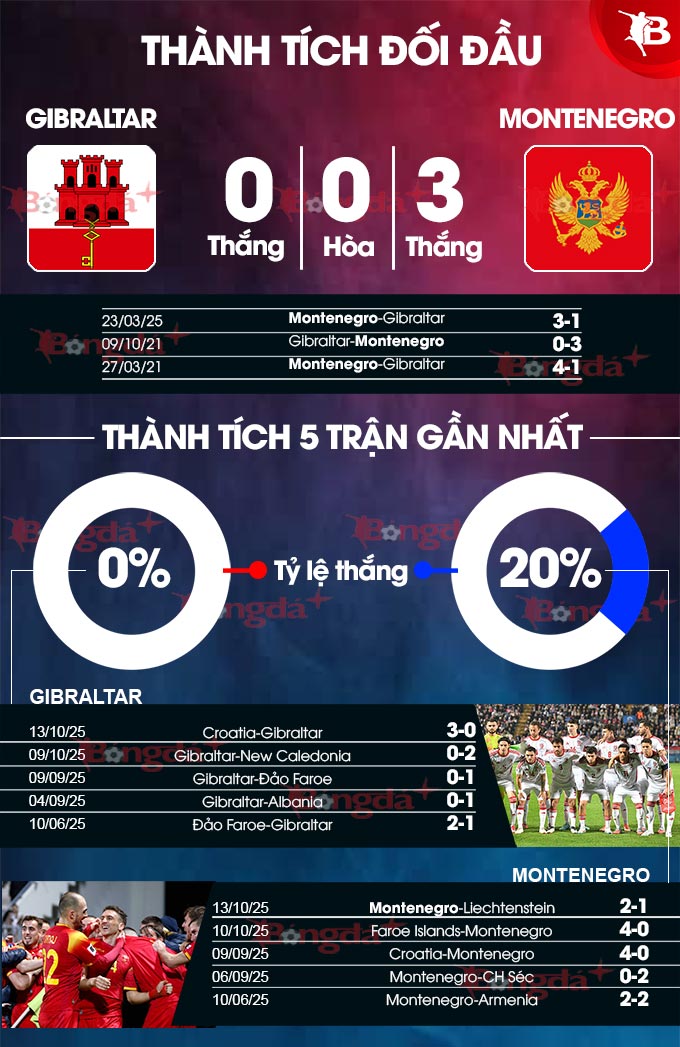 - Hai đội không cùng ghi bàn: Cả 4 trận vừa qua của Gibraltar đều có một đội "tịt ngòi". 3/4 trận gần đây của Montenegro cũng luôn có một bên thành công trong việc giữ sạch lưới.