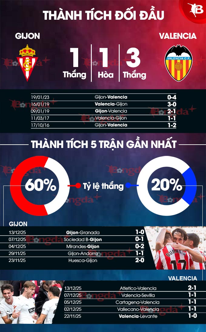 - 2 hoặc 3 bàn cả trận: 4/5 cuộc đối đầu gần nhất, 5/7 trận vừa qua của Gijon và 5/6 trận gần đây của Valencia đều khép lại với 2 hoặc 2 bàn cả trận. Hơn nữa, cả 3 chuyến làn khách vừa qua của Valencia cũng chứng kiến từ 2 đến 3 bàn cả trận.