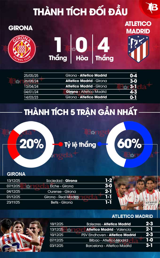 Thành tích đối đầu giữa Girona và Atletico Madrid cho thấy sự áp đảo rõ rệt của đội bóng áo sọc đỏ trắng thành Madrid, với 4 chiến thắng trong 5 lần gặp nhau gần nhất. Cuộc chạm trán gần nhất chứng kiến Atletico giành chiến thắng 4-0 trên sân khách trước Girona, trong khi các chiến thắng trên sân nhà của họ cũng rất thuyết phục. Mặc dù Girona đang cải thiện đáng kể thành tích sân nhà gần đây, nhưng nhiều khả năng Atletico vẫn nắm giữ lợi thế đáng kể trong trận đấu này.