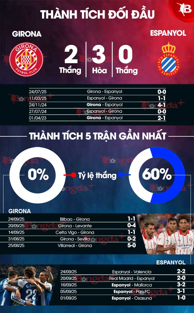 Espanyol thực tế chưa từng đánh bại Girona kể từ tháng 4/2019, nhưng 2 chiến thắng gần nhất của họ trước đội bóng láng giềng đều diễn ra trên sân khách, trước đó là chiến thắng vào tháng 4/2018 tại giải đấu hàng đầu Tây Ban Nha.