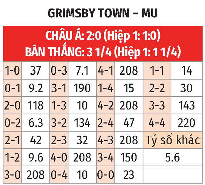- Lưới rung 25 phút cuối: 4/5 trận gần nhất của Grimsby có bàn thắng ở 25 phút cuối. Chưa hết, 3/5 trận mới đây của MU cũng có bàn thắng từ phút 65 trở đi. Xem ra, trận này khó có ngoại lệ.