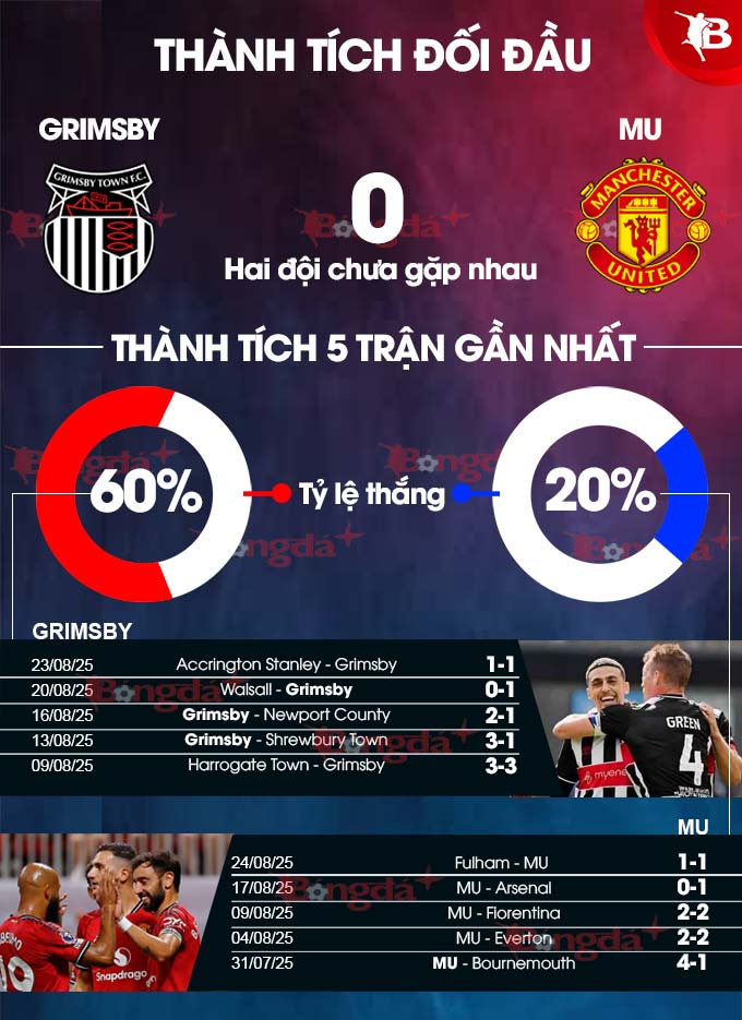 Phong độ của Grimsby vs MU có sự chênh lệch. Trong khi Grimsby bất bại ở 9 trận gần nhất thì MU chỉ thắng 4 ở cùng thời gian, tính trong 90 phút. Trên sân nhà, Grimsby cũng toàn thắng 5 trận vừa qua, còn MU chỉ thắng 1/7 trận gần nhất khi làm khách.