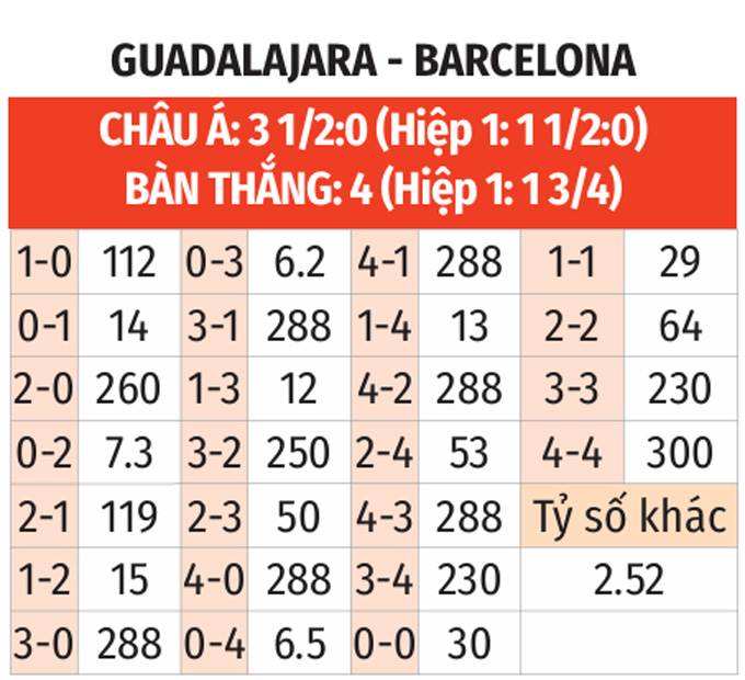 - Tối thiểu 2 bàn ở hiệp 1: 3/5 trận gần nhất của Guadalajara đều có từ 2 bàn thắng trở lên trong hiệp 1. Chưa hết, 5/8 trận vừa qua của Barca cũng có kịch bản tương tự.