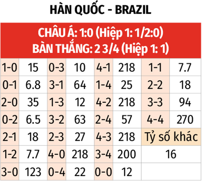 - Ít nhất 1 bàn thắng hiệp 1: 6 trận liên tiếp của Hàn Quốc cùng 5/6 trận vừa qua của Brazil đều xuất hiện ít nhất 1 bàn thắng trong hiệp đầu. 5 trận đối đầu trong quá khứ cũng có bàn thắng trước giờ nghỉ.