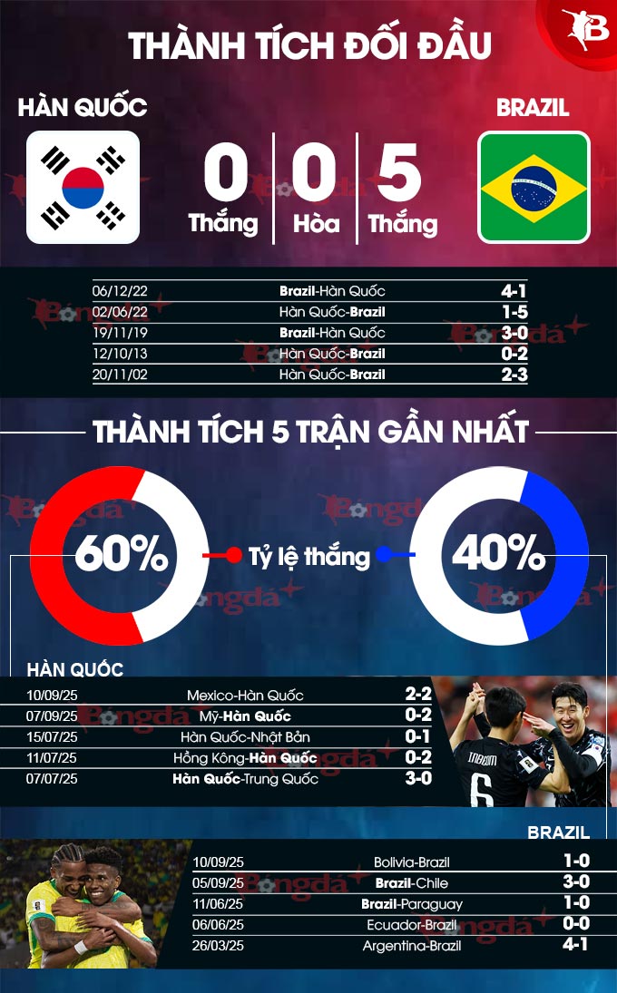 Lần gần nhất Brazil thi đấu là vào ngày 10/9, trong thất bại 0-1 trước Bolivia. Đồng thời, họ mới chỉ giành được 2 chiến thắng trong 5 trận gần nhất. Có thể thấy, phong độ của đoàn quân HLV Carlo Ancelotti là không ổn định. Xét về sức mạnh đội hình, Brazil hơn hẳn Hàn Quốc, nhưng điều này không có nghĩa là họ sẽ dễ dàng đánh bại đối thủ.