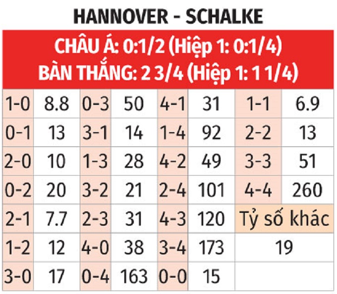 - Schalke thắng châu Á hiệp 1: Hannover thua theo châu Á 3, hòa 1 ở hiệp thi đấu đầu tiên trong 4 trận vừa qua tại giải hạng 2 Đức. Lịch sử cũng chứng kiến Hannover để thua Schalke 4/5 trận đối đầu gần nhất trong hiệp 1.