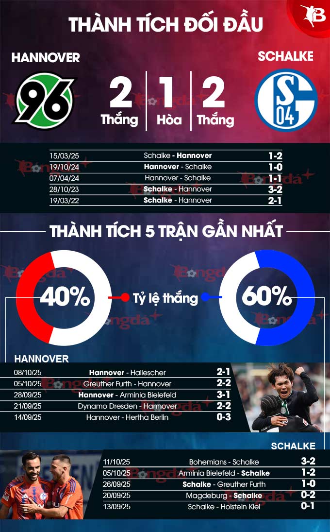 - Từ 3 bàn thắng trở lên: 8 trận liên tiếp gần đây của Hannover cùng 2 trận vừa qua của Schalke đều kết thúc với ít nhất 3 bàn thắng được ghi. 3/5 trận đối đầu gần nhất cũng có thống kê tương tự.