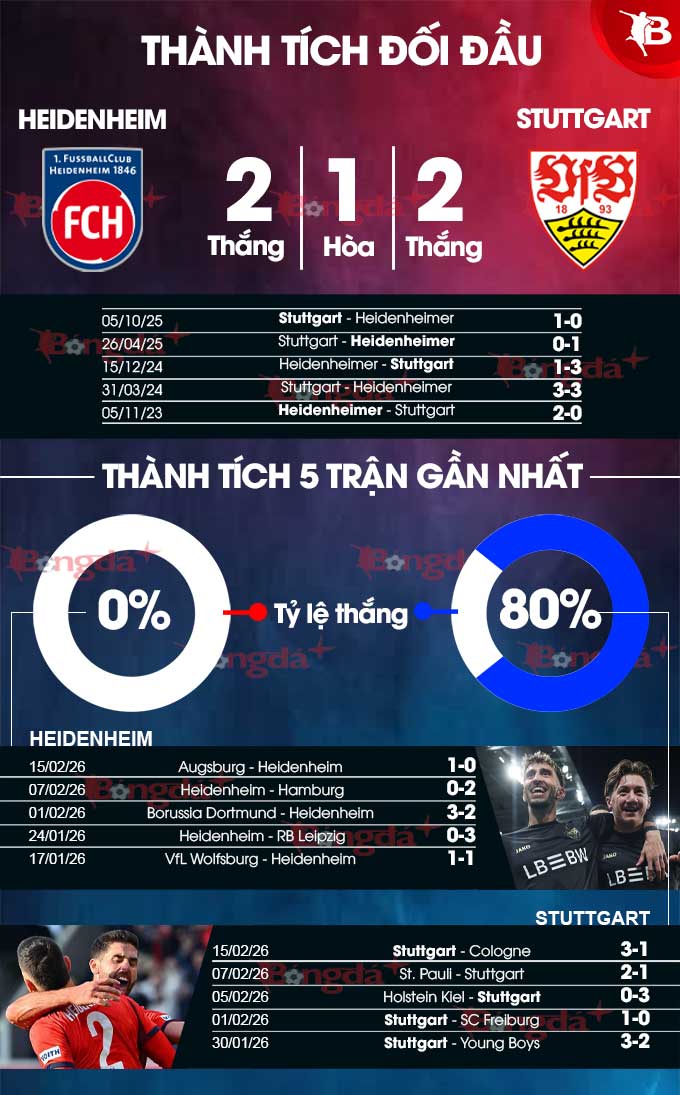 Trong khi đó, Stuttgart của HLV Sebastian Hoeness lại đang tận hưởng một mùa giải thăng hoa. Họ bước vào trận đấu Heidenheim trong bối cảnh đang có một vị trí trong top 4 BXH. Với chiến tích giành tới 6 chiến thắng ở 7 trận gần nhất trên mọi đấu trường, Stuttgart mà không hạ nổi Heidenheim ngay tại sào huyệt đối phương thì đây đúng là chuyện lạ.