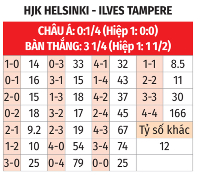 - HJK Helsinki thua theo châu Á: Ilves Tampere mới thắng theo châu Á ở 6/8 trận sân khách gần đây tại giải VĐQG Phần Lan. Ngoài ra, họ cũng thắng theo châu Á ở 4/5 trận gặp HJK Helsinki gần nhất nên là sự lựa chọn đáng tin cậy hơn đội chủ nhà.