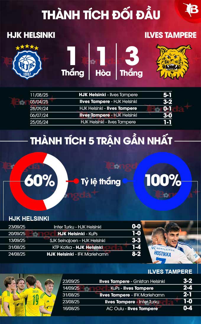 Trong những lần chạm trán Ilves Tampere gần đây, HJK Helsinki được hưởng niềm vui thì ít mà phải nhận "trái đắng" lại nhiều. Phải so T cùng đối thủ đang thắng như chẻ tre, HJK Helsinki rất có thể sẽ trắng tay ngay tại sào huyệt của mình.