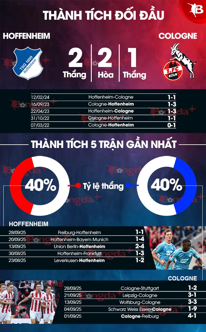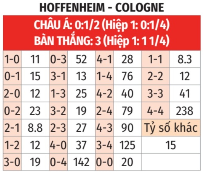 - Nhiều bàn thắng hiệp 1: 3/4 lần gặp giữa 2 đội gần đây đều có từ 2 bàn thắng trở lên trong hiệp 1. 4/5 trận gần đây của Hoffenheim và 4 trận gần nhất của Cologne xảy ra tình trạng tương tự.