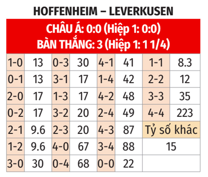 - Từ 4 bàn trở lên: 6/9 cuộc đối đầu gần nhất, 2/3 trận gần đây của Hoffenheim và 3/4 trận vừa qua của Leverkusen đều có tối thiểu 4 lần lưới rung cả trận. Ngoài ra, 8/10 trận sân nhà gần đây của Hoffenheim tại Bundesliga cũng có kết cục tương tự.