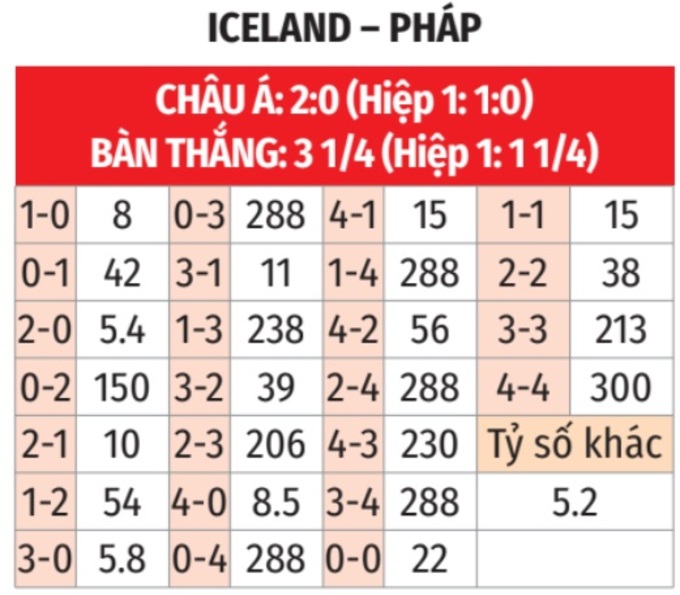- Tối đa 1 bàn hiệp 1: 3/4 lần gặp nhau giữa 2 đội gần đây chỉ có nhiều nhất 1 bàn thắng trong hiệp 1. 6/9 trận sân nhà gần đây của Iceland và 3/4 trận gần nhất của Pháp xảy ra tình trạng tương tự.
