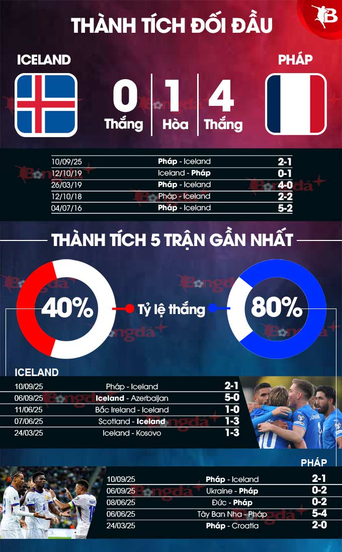 Đặc biệt, Pháp luôn át vía Iceland trong quá khứ. Thống kê cho thấy, trong 6 lần đụng độ, Gà trống Gaulois bất bại. Cụ thể, họ thắng 5 và hòa 4. Trong đó, ở cả 4 trận đấu tại các giải chính thức, Pháp đều thắng.