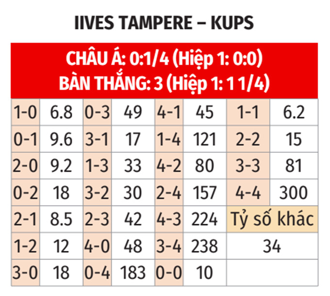- Hiệp 1 không quá 1 bàn: 5/8 cuộc đối đầu chính thức gần nhất, 6/8 trận gần đây của Ilves Tampere và cả 2 trận vừa qua của KuPS đều có tối đa 1 bàn trong hiệp 1. Ngoài ra, 9/11 trận sân nhà vừa qua của Ilves Tampere cũng đều có không quá 1 lần lưới rung trong hiệp 1. Trận này khó có ngoại lệ.