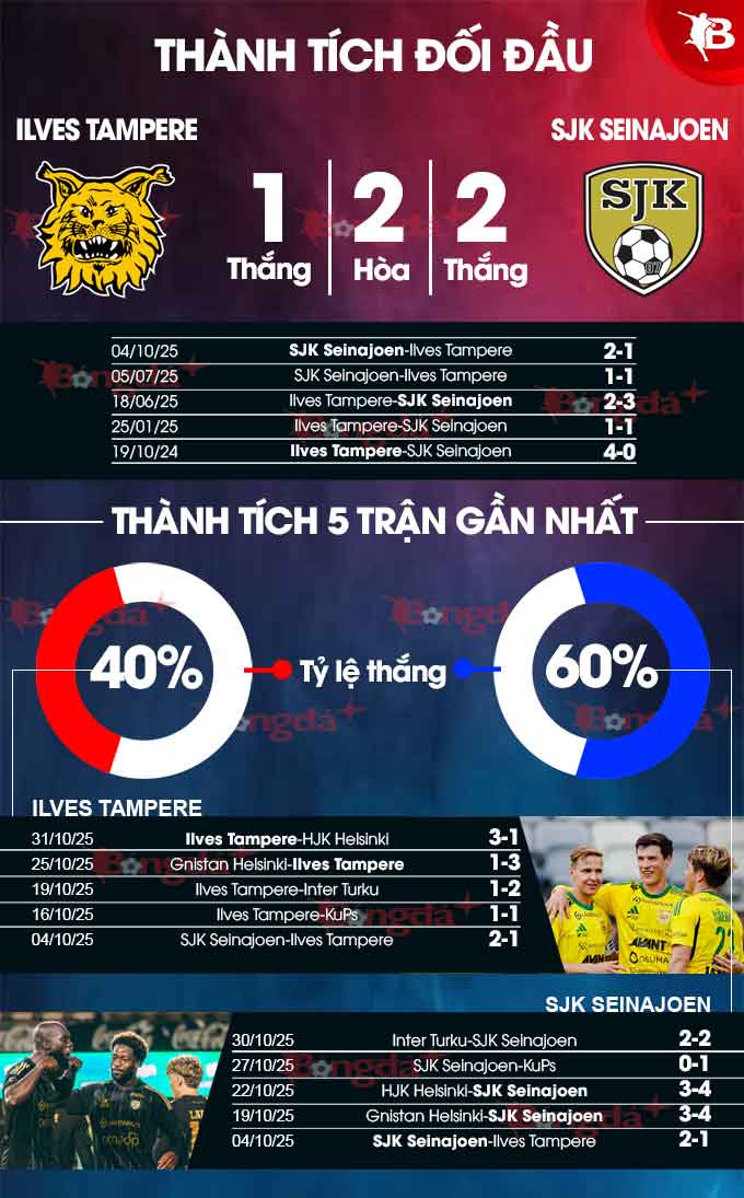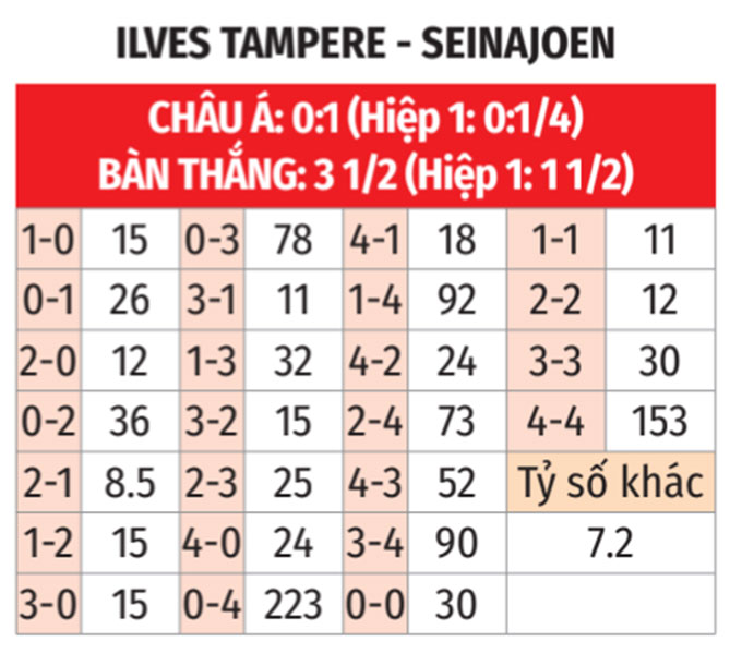 - Tối thiểu 4 bàn: 3/4 trận gần đây của SJK Seinajoen đều có tối thiểu 4 bàn. 4/5 trận Ilves Tampere tiếp đón SJK Seinajoen gần nhất số lần lưới rung cũng luôn chạm tới ngưỡng 4.