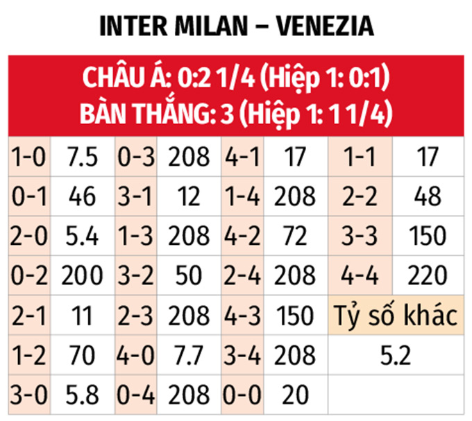- Tối đa 4 góc hiệp 1: Những trận đấu gần đây của Inter Milan thường không xuất hiện xu hướng "cày góc" sớm, khi 4 trận liên tiếp đều có tối đa 4 tình huống đá phạt góc trong hiệp đầu tiên. Thậm chí, 2 trận ra quan trong một tuần qua của Neazzurri chỉ có tổng cộng 3 quả góc trong hiệp một. Với Venezia, 3/5 trận vừa qua của đội khách cùng 2/3 trận đối đầu gần nhất cũng xuất hiện không quá 4 lần bóng được đặt ở bốn cột góc cuối sân trước giờ nghỉ.