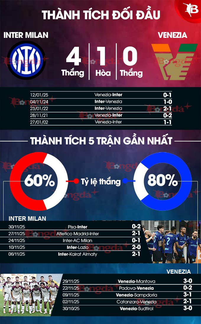 Phong độ của Venezia trước chuyến hành quân tới Giuseppe Meazza là rất thuyết phục với 3 trận liên tiếp toàn thắng tại Serie B. Tuy nhiên, chừng đó thôi có lẽ là chưa đủ để Lagunari có thể nghĩ tới chuyện tạo nên địa chấn trước Inter Milan.