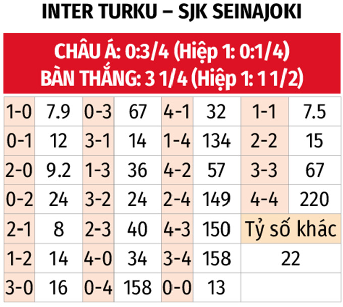 - Từ 3 đến 4 bàn thắng: 4/5 trận gần đây của Inter Turku đều có từ 3 đến 4 bàn thắng được ghi. Lịch sử đối đầu cũng chứng kiến 7/8 trận chính thức gần nhất giữa đôi bên cũng xuất hiện từ 3 đến 4 pha làm bàn.