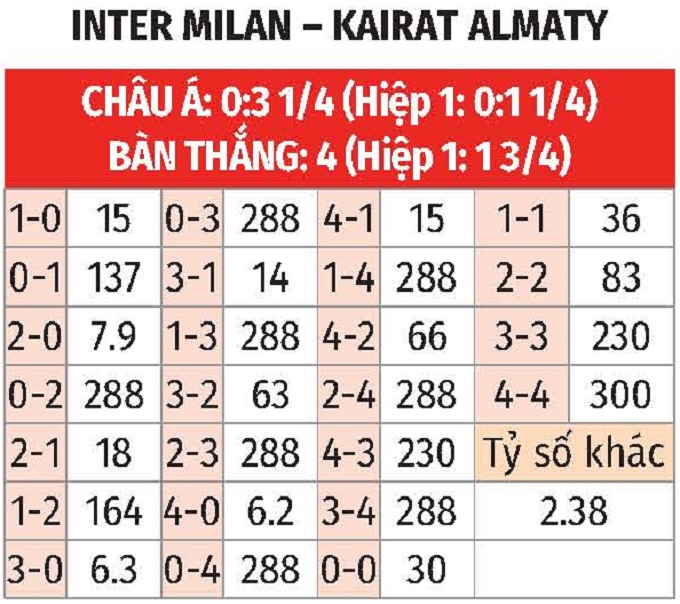 - Tối đa 3 bàn: Những trận đấu có sự góp mặt của Inter Milan thời gian qua thường diễn ra rất chặt chẽ và kín kẽ, khi 8/10 trận gần đây trên mọi đấu trường đều có tối đa 3 bàn được ghi. Với Kairat Almaty, hàng công đội khách tịt ngòi 5/6 trận gần đây tại Champions League.