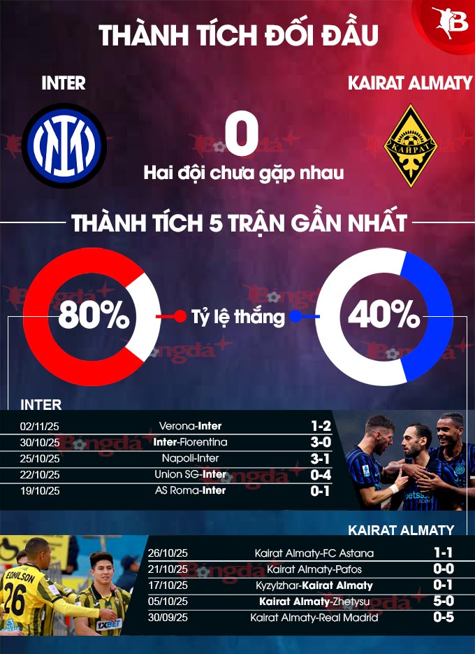 Cuộc gặp gỡ giữa Inter vs Kairat Almaty đánh dấu lần đầu tiên trên hai phương diện: họ chưa từng đối đầu nhau, và cũng là lần đầu tiên hai đội bóng đến từ Italia và Kazakhstan chạm trán nhau tại đấu trường châu Âu. Đối với Inter, đây là cơ hội để củng cố danh tiếng là đội bóng phòng ngự hiệu quả nhất lục địa, còn với Kairat - việc được thi đấu tại sân Giuseppe Meazza huyền thoại đã là một cột mốc đáng nhớ.