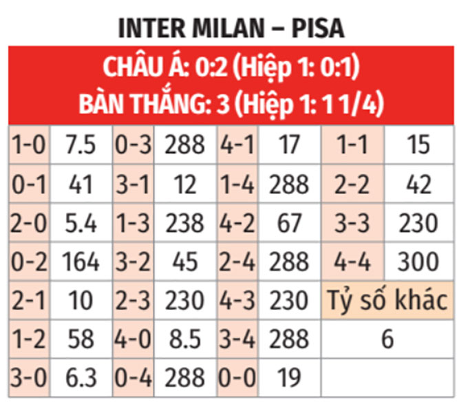 - Inter thua theo châu Á: Inter đang tỏ ra kém duyên với 4 trận thua theo châu Á liên tiếp. Tiếp đón Pisa thắng theo châu Á 4/5 trận vừa qua, đội chủ nhà không phải là sự lựa chọn đáng tin cậy.