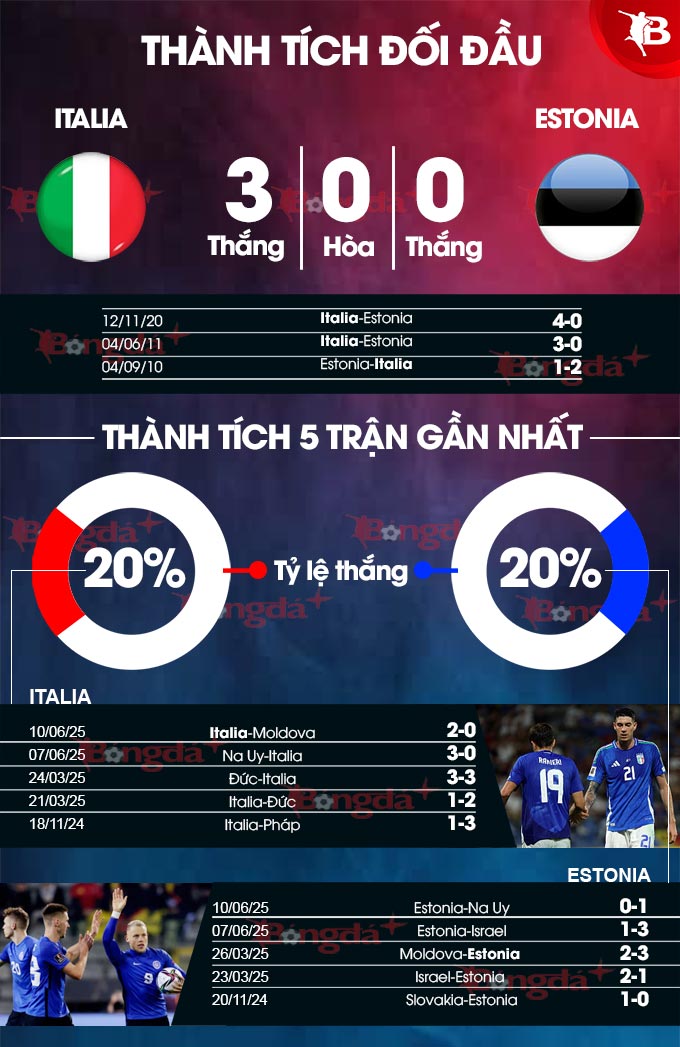 - T phạt góc: 3/4 trận đấu gần đây của Italia đều xuất hiện từ 10 quả phạt góc trở lên. Tình trạng tương tự xảy ra ở 5/7 trận gần đây của Estonia.
