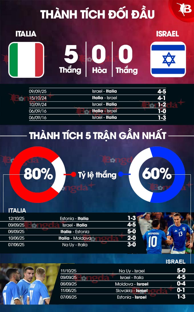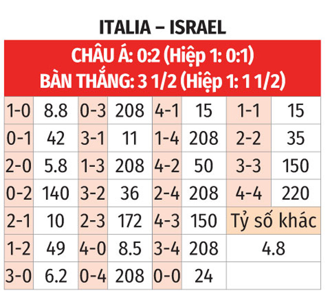 Chưa hết, Italia còn sở hữu đội hình chất lượng hơn và lại đang có đà tâm lý tốt. Trong khi đó, Israel khó hồi phục tinh thần sau khi vừa thảm bại 0-5 trước Na Uy. Do đó, Italia nhiều khả năng vẫn sẽ có 3 điểm ở trận này.