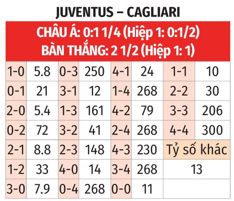 - Juve thắng theo châu Á: Juve chỉ vừa thắng Bodo Glimt ở Champions League, nhìn chung chưa thể được đánh giá cao. Ngược lại Cagliari thắng theo châu Á 5/6 trận sân khách gần đây tại Serie A. Nhưng điều vô lý là Juve nhường tới 1 ½ bàn, tỷ lệ này là quá sâu! Trong 8 lần đối đầu gần nhất tại Turin khi Juve nhường 1 ½ bàn trở lên, thành tích theo châu Á của Lão phu nhân là thắng 7, hòa 1. Juve cũng thắng theo châu Á 4/5 trận chính thức vừa qua trên sân nhà khi nhường 1 ¼ đến 1 ¾ bàn.