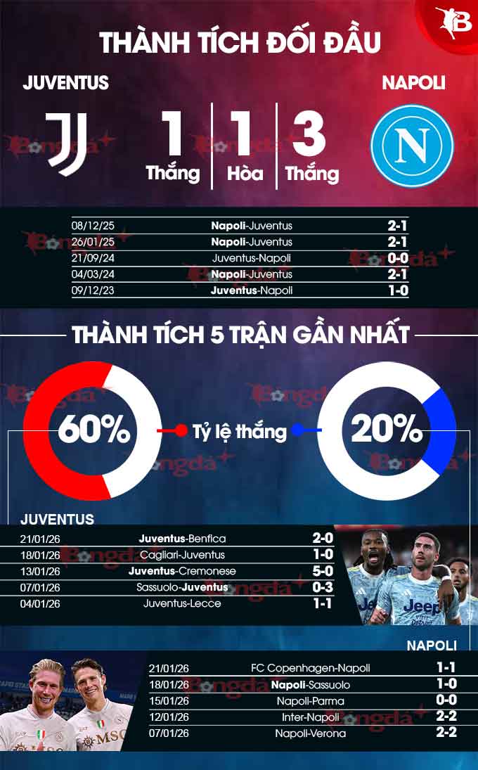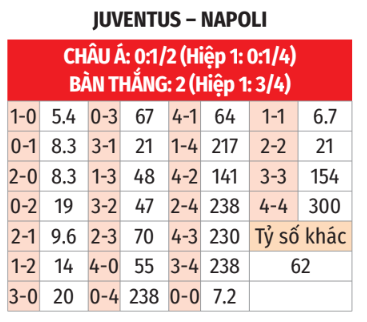 - Tối đa 2 bàn: 16/20 trận chính thức gần đây của Napoli, 4/6 trận sân nhà vừa qua của Juve và cả 4 lần đối đầu gần nhất giữa đôi bên ở Turin đều khép lại với không quá 2 bàn.