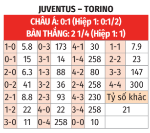 - Juve thắng theo châu Á: Juve đang có phong độ xoàng dẫn tới việc phải thay tướng nên nhường 1 bàn trước đối thủ cùng thành phố là sâu, nhất là khi Torino thắng theo châu Á 4/5 trận vừa qua. 5 trận sân nhà gần đây khi nhường đối phương 1 đến 1 ¼ bàn, Juve bất bại theo châu Á (thắng 4, hòa 1). Juve cũng thắng theo châu Á 4/6 lần đối đầu gần nhất giữa đôi bên với tỷ lệ dao động từ 1/2 đến 1 bàn.