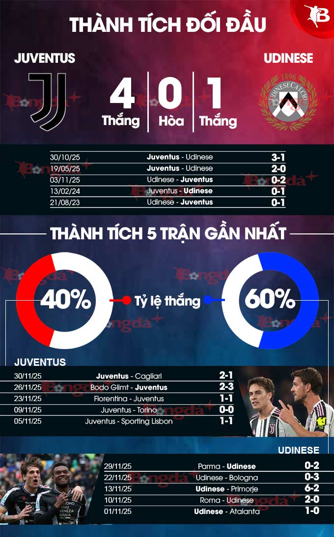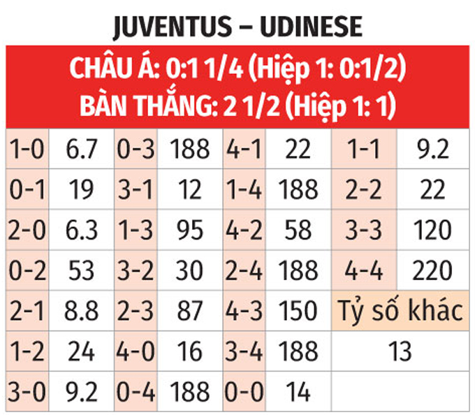 - Chẵn bàn thắng: 3 trận so T gần đây giữa 2 đội có tổng bàn thắng chia hết cho 2. Ngoài ra, 3/5 trận vừa qua của Juventus và 5 trận vừa xong của Udinese đều chứng kiến điều tương tự.