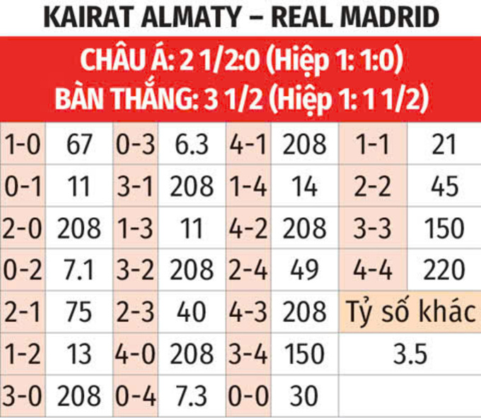 - Nhiều bàn thắng hiệp 1: 5/6 trận đấu gần đây của Real Madrid đều xuất hiện từ 2 bàn thắng trở lên trong hiệp 1. Trận đấu gần đây nhất của Kairat Almaty cũng có 2 bàn thắng ở hiệp đầu. Kairat Almaty quá yếu, nên rất khó cưỡng lại trước sức mạnh của Real Madrid.
